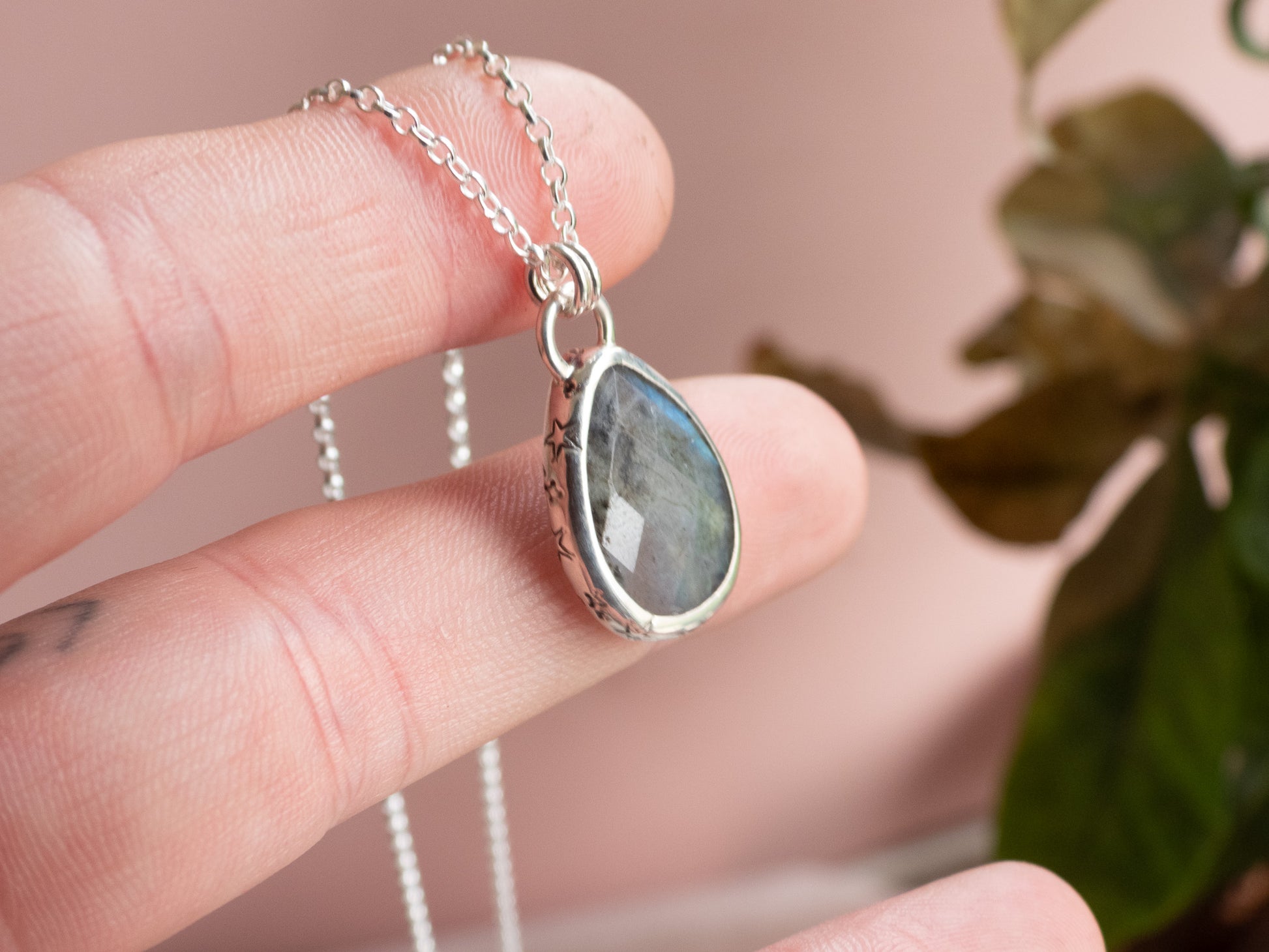 This faceted labradorite stone has been wrapped in a sterling silver frame and stamped with celestial stars for a unique boho vibe.