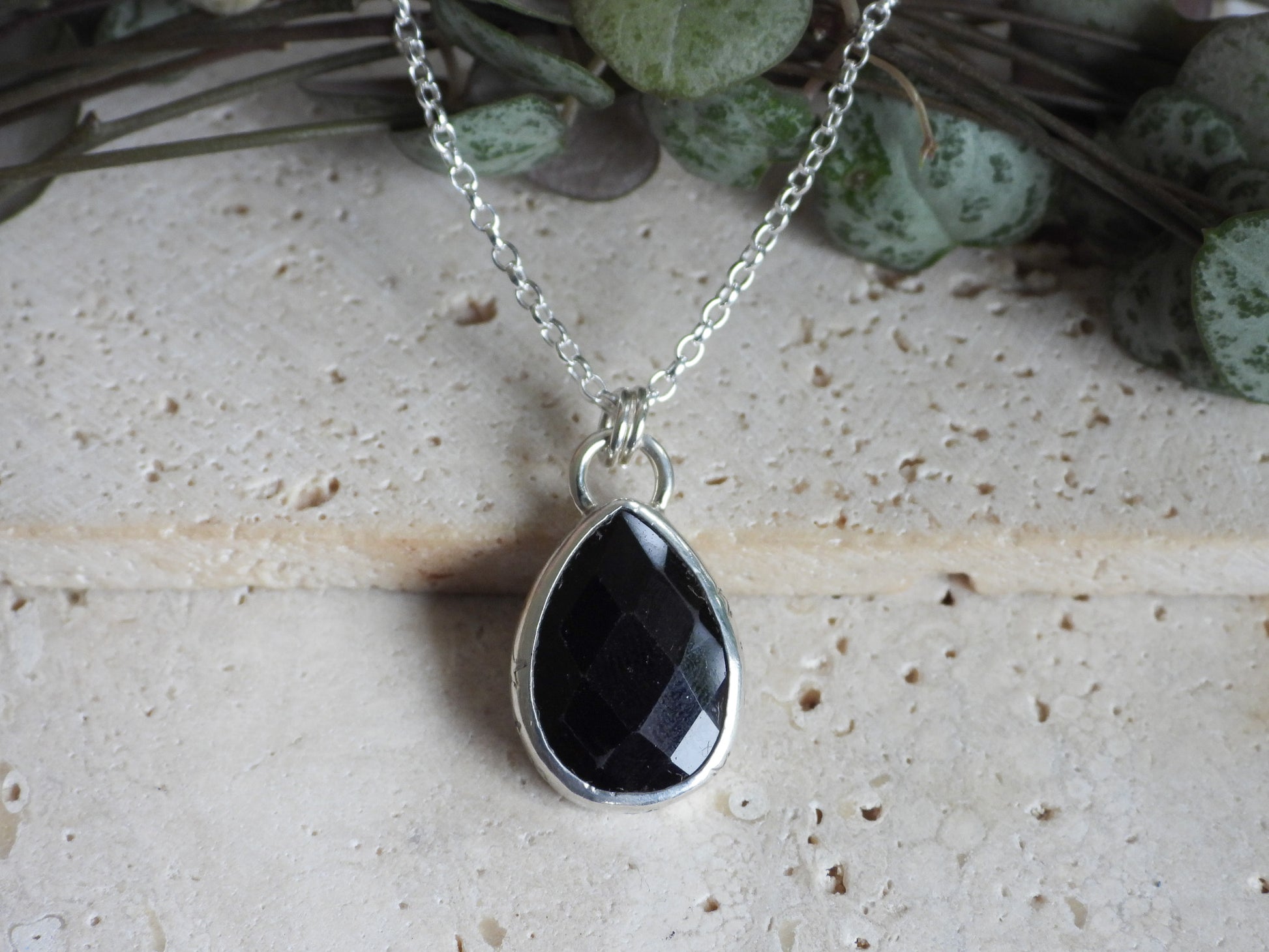 This faceted black Tourmaline stone has been wrapped in a sterling silver frame and stamped with celestial stars for a unique boho vibe.