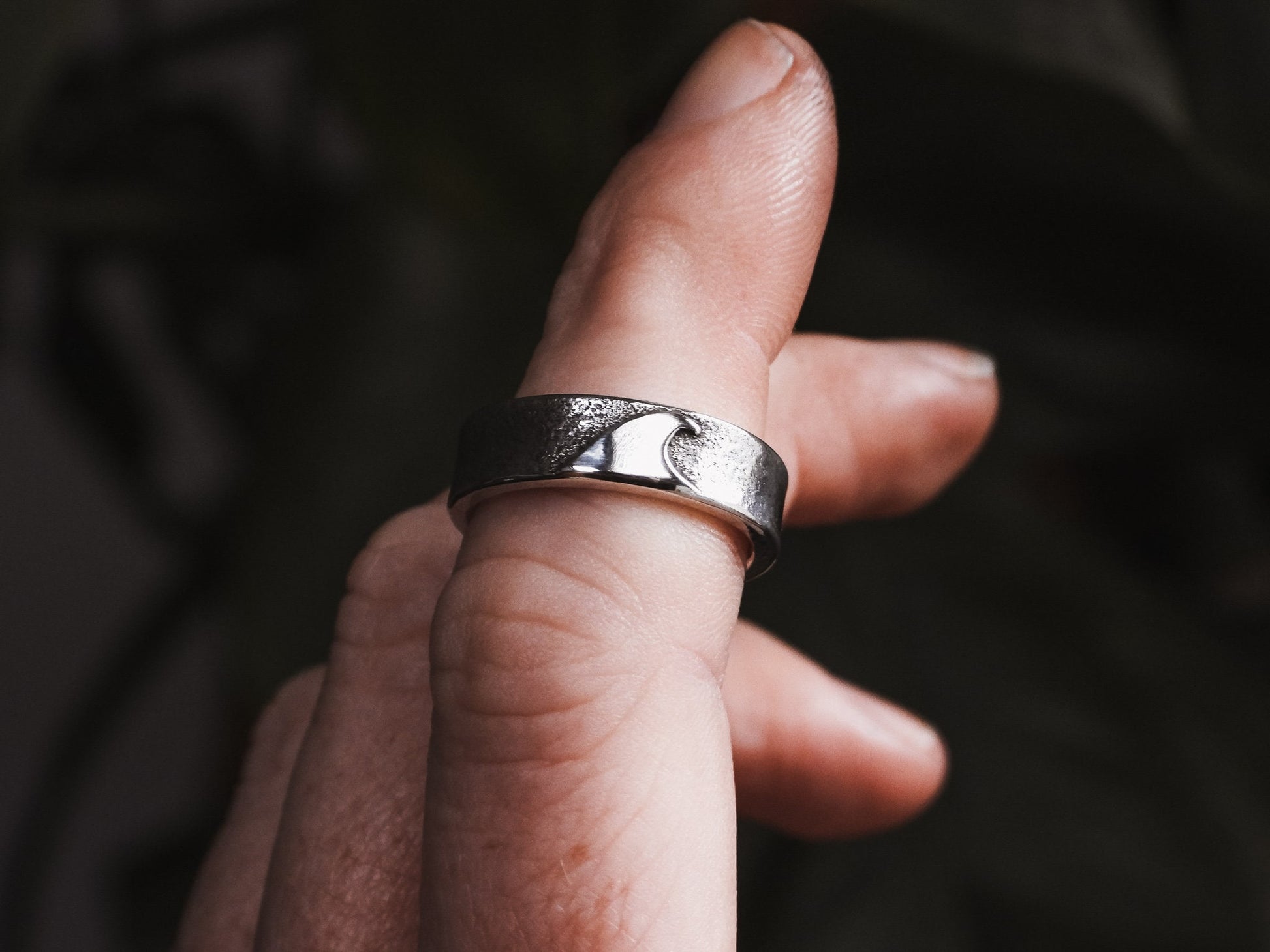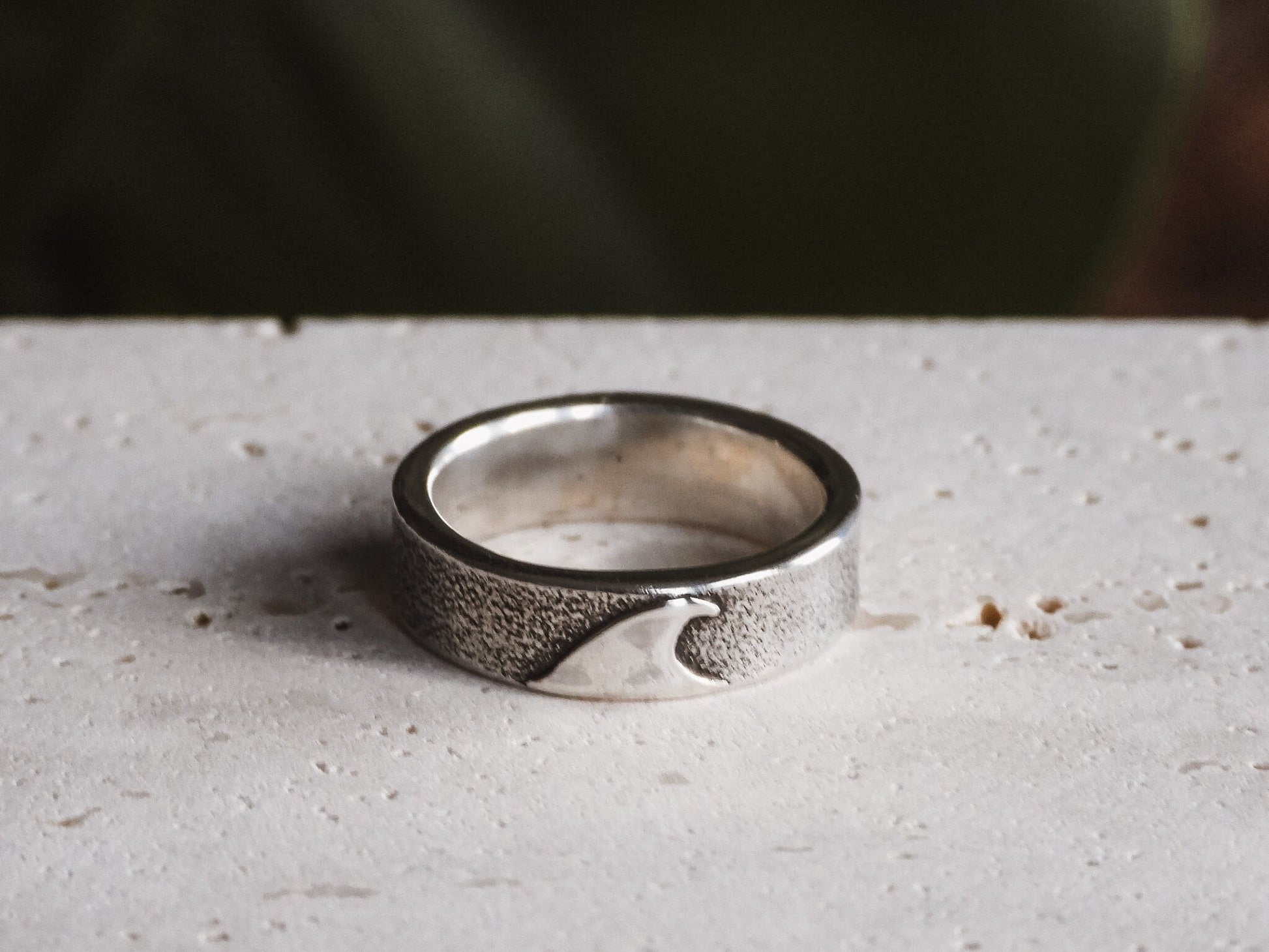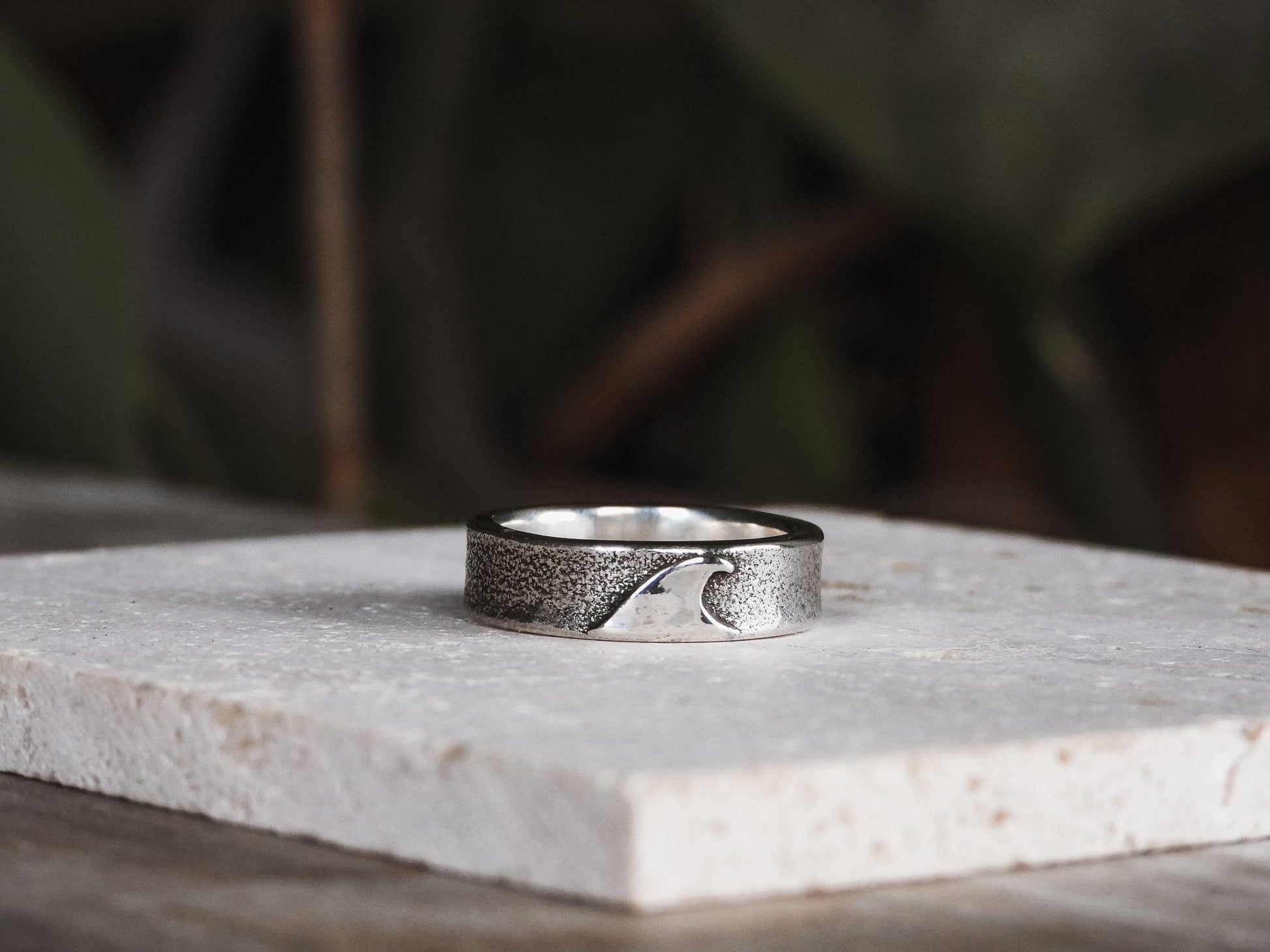 Inspired by the Cornish Coast, this ring features a highly polished wave, to contrast against the rustic background.