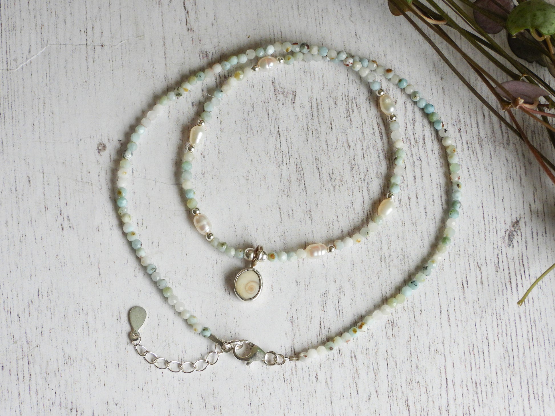 Larimar & Pearl Necklace with Shiva Shell Charm | Morvoren Collection