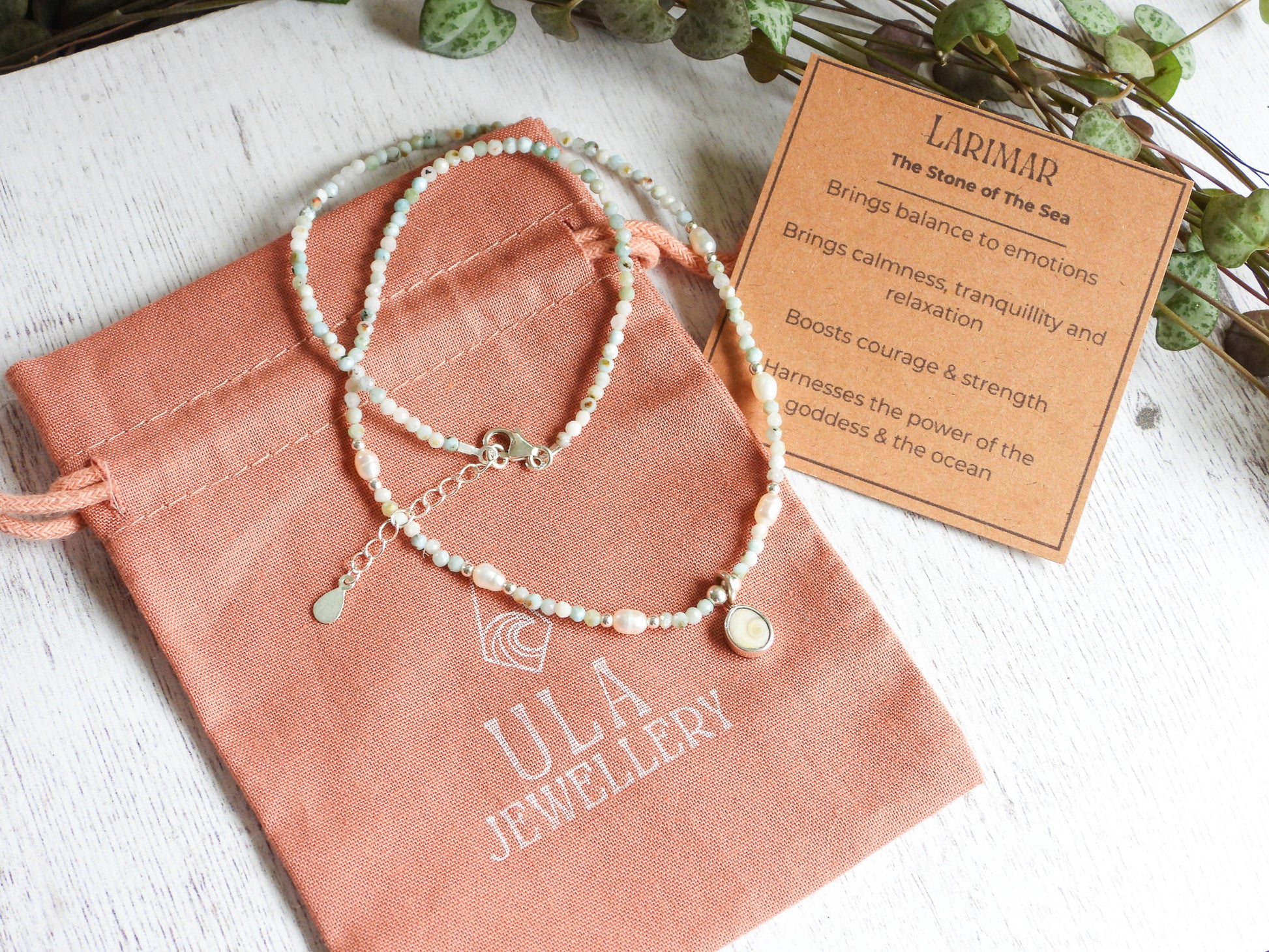 Larimar is a rare gemstone known for its calming properties, whilst the shiva shell is said to protect travellers, especially those travelling by boat.