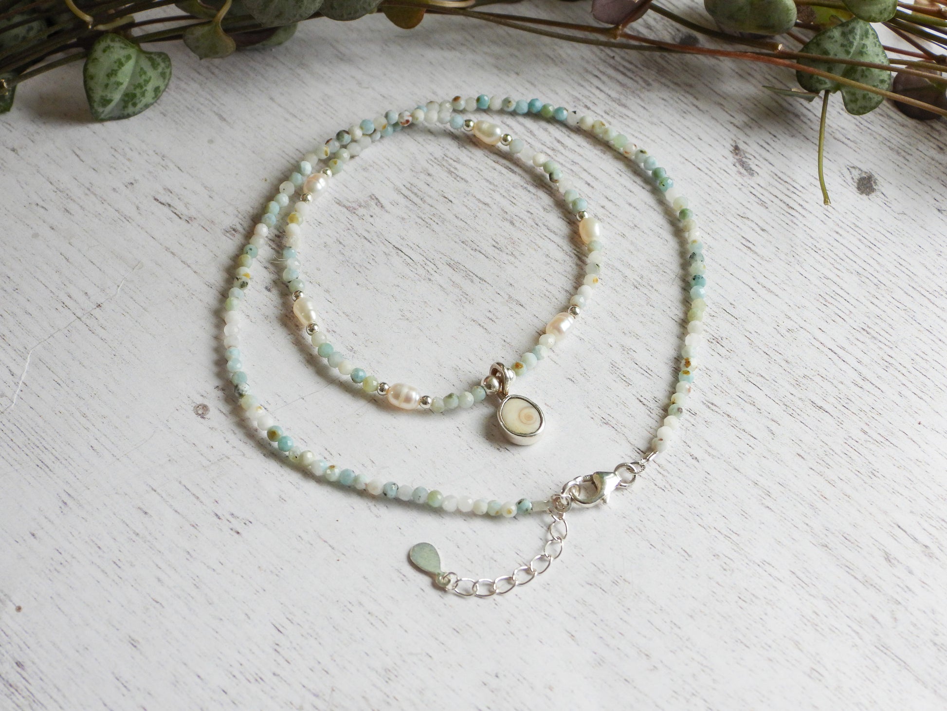 This dainty little necklace is handmade usine 2mm faceted larimar beads, freshwater potato pearls and solid sterling silver beads.