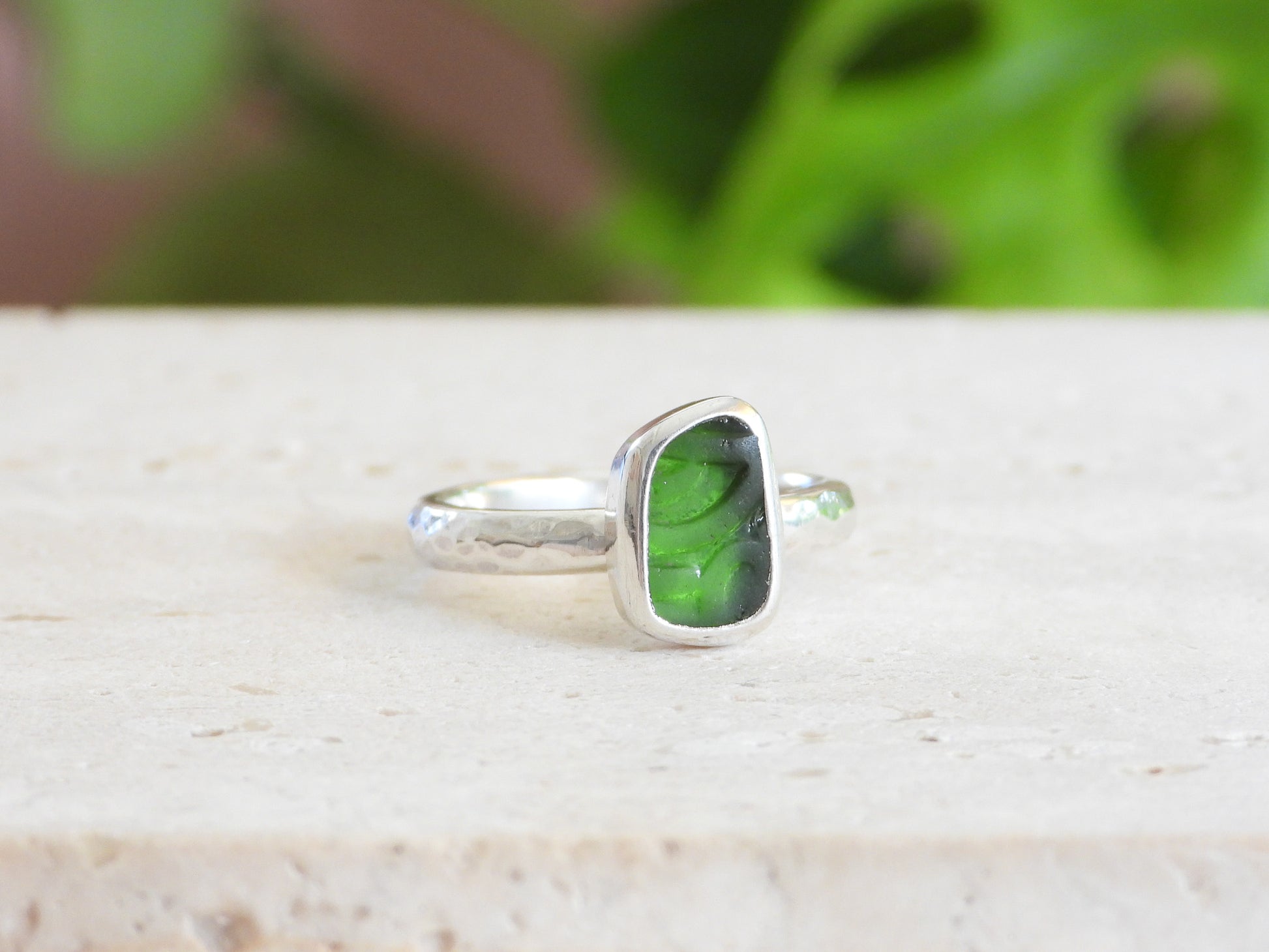 Rare Embossed Green Seaglass Ring | Recycled Silver 925 | Size L/M