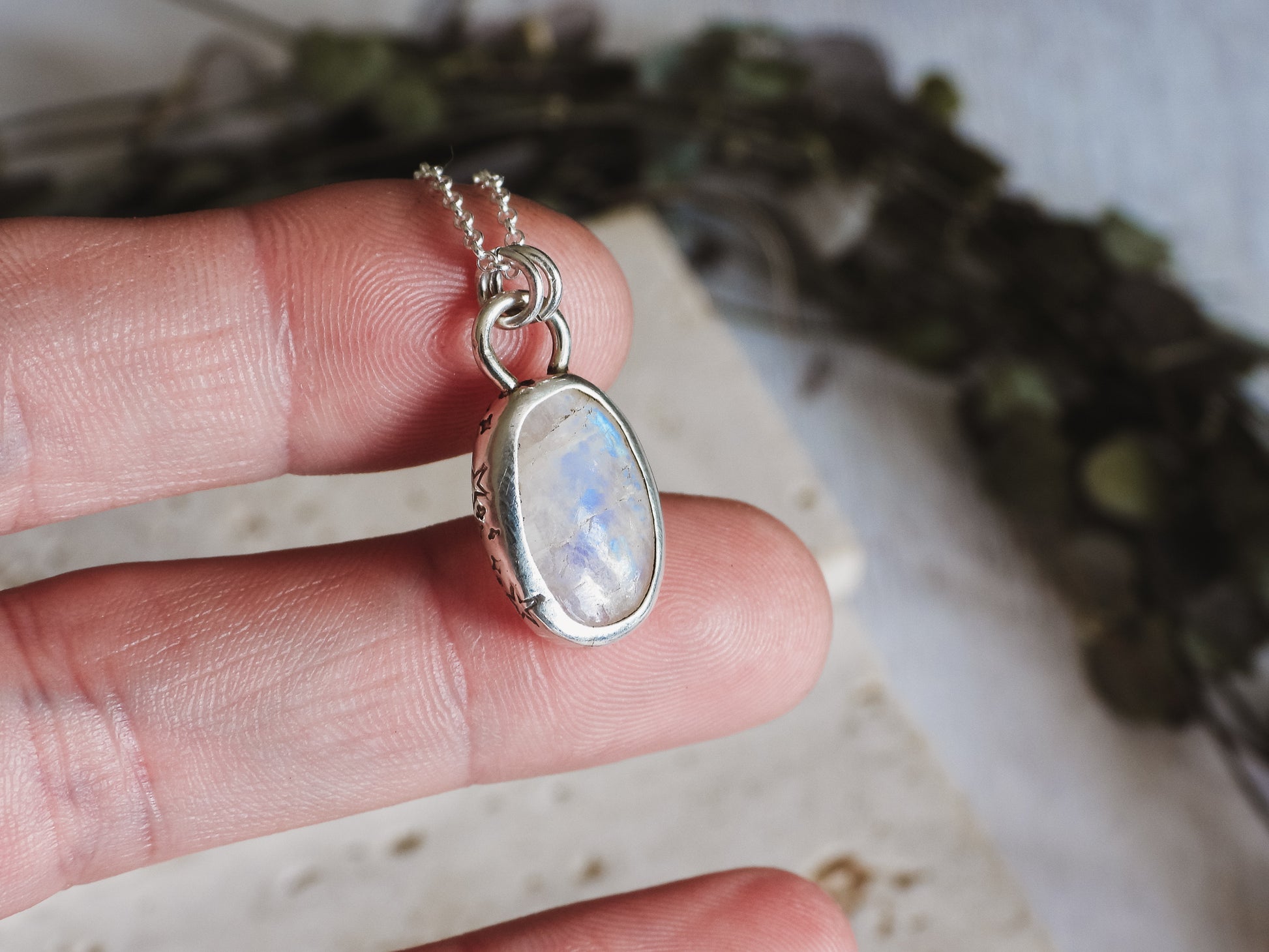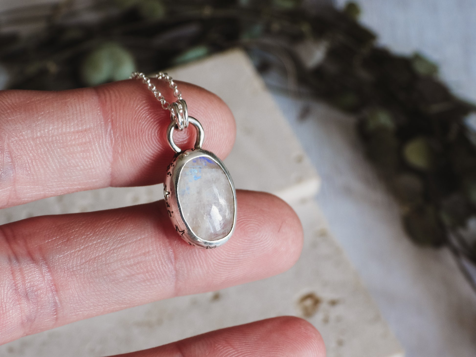 This grade AA rainbow moonstone is encased in a hand-stamped, stary pattern for a unique and witchy vibe, perfect for halloween!